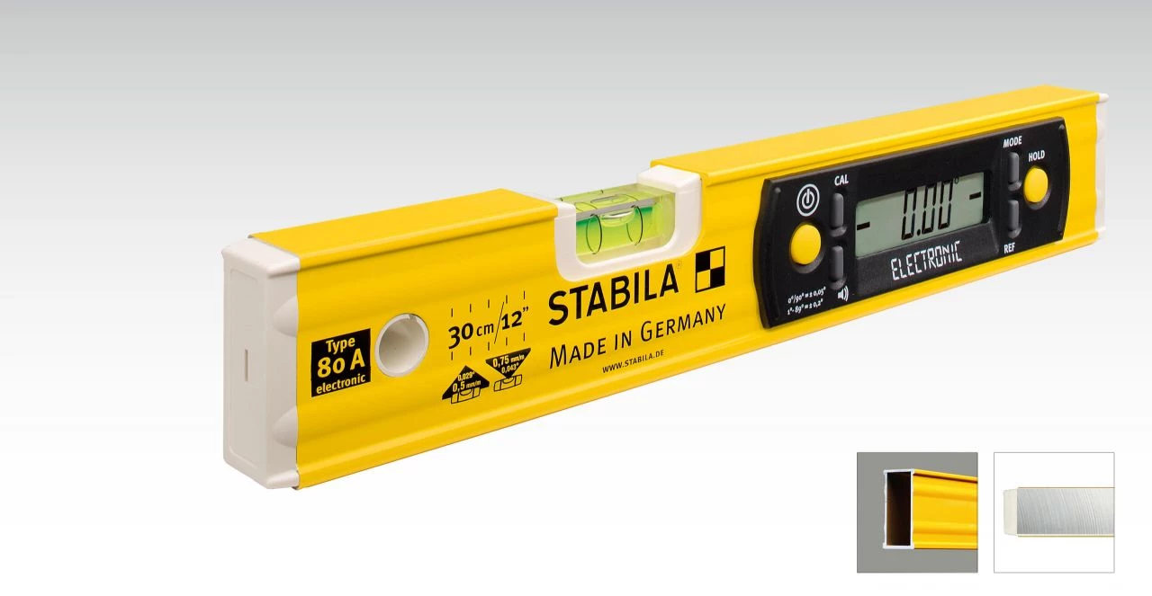 Ce niveau à bulle compact, de haute qualité et robuste, convient à tous les types de travaux. La technologie de mesure électronique et le flacon horizontal rendent le travail plus rapide et plus facile. L’affichage numérique est facile à lire dans toutes les positions de mesure. Le profil rectangulaire en aluminium avec nervures de renforcement et la technologie intégrée STABILA avec niveau à bulle fixe garantissent la précision et une longue durée de vie. Il n’y a pratiquement rien que ce niveau à bulle ne puisse faire.